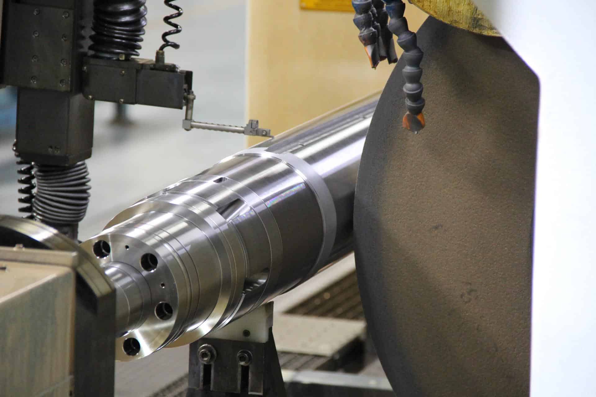 Das Außenrundschleifen von Bauteile bis Durchmesser 1000 mm und 6m Länge, mit Stückgewichten von bis zu 8 t ist möglich. Eine Maschine mit B-Achse und zwei Schleifscheiben ermöglicht uns unterschiedliche Schleifoperationen oder mit unterschiedlichen Materialien beschichtete Bauteile in einer Einspannung zu schleifen.